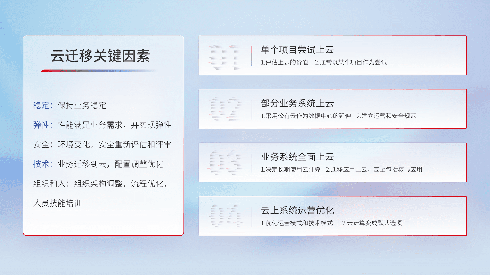 结合实际业务,,,从规划设计、、、云平台选型、、、、云原生改造、、数据迁移、、集成交付,,迁移全过程为客户识别最佳上云路径,,,做好风险识别管理,,,设计网络架构、、身份权限、、、、安全审计合规、、、、操作审计、、日志审计、、监控告警策略、、多站点容灾设计等,,对云上基础设施进行整体规划,,提升IT治理水平,,,以满足弹性、、、、高可用、、、、高性能的需求。。。。