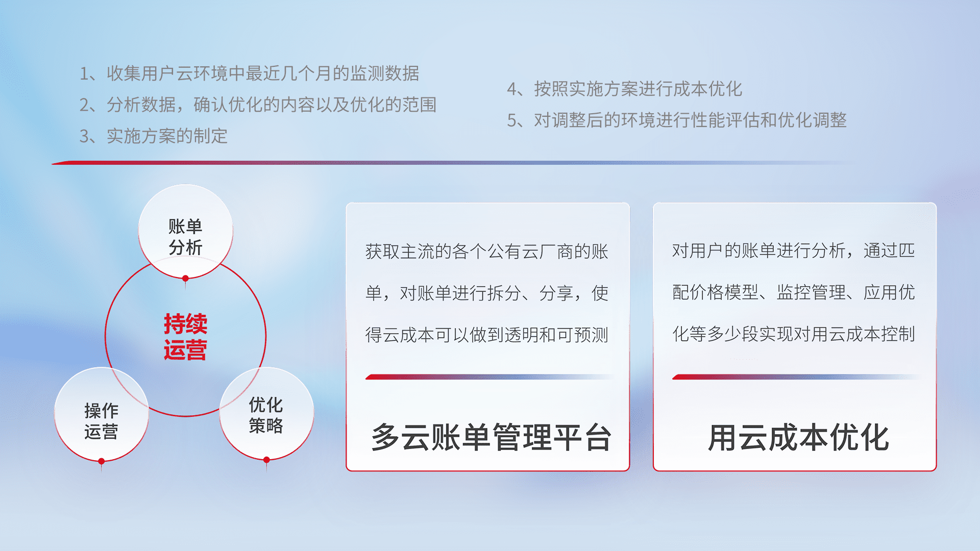 通过多云纳管,,以统一的资源数据模型把客户的云资源进行抽象和封装,,,进而实现对多云资源的统一操作,,保障云资源管理的可靠性、、、、稳定性与可用性。。。。量身定制化运维内容,,配置、、、、开发运维、、、、补丁管理、、、备份、、、监控、、、、认证和访问管理、、、审计和日常巡检等,,,,保障在用云过程中的可靠度,,,稳定度以及高可用率。。